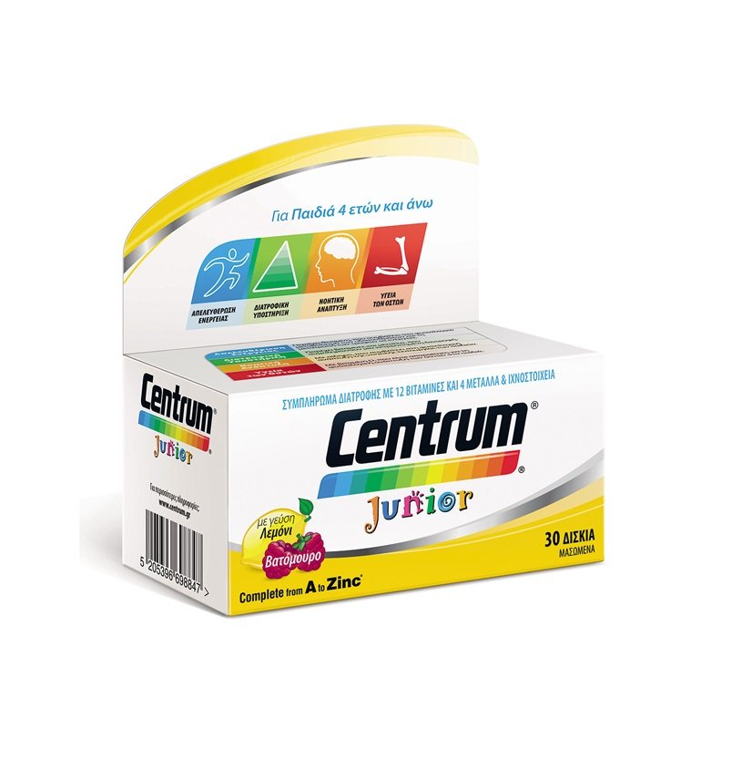 Το Centrum Junior, με ειδικά διαμορφωμένη σύνθεση βιταμινών και μετάλλων, συμπληρώνει την καθημερινή διατροφή των παιδιών. Κατάλληλο για παιδιά 4 ετών και άνω. Σε μασώμενα δισκία. Με ευχάριστη γεύση βατόμουρο-λεμόνι.