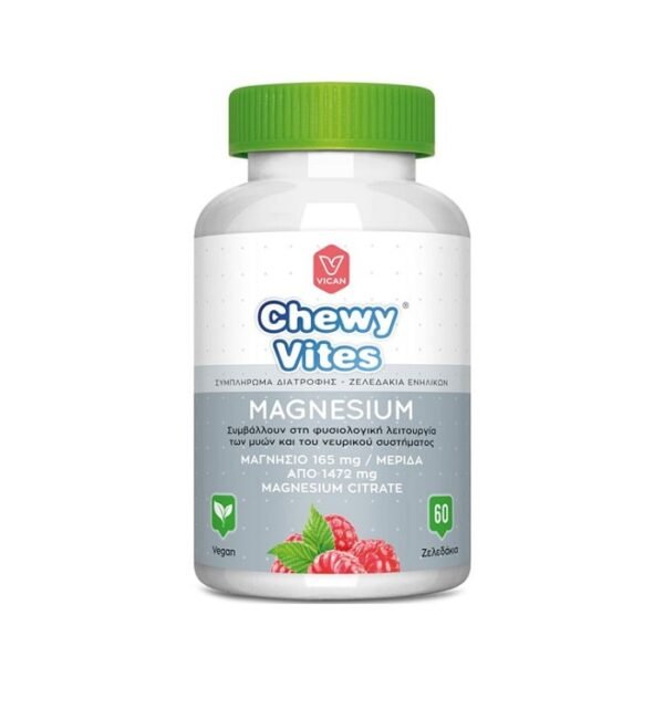 Τα Chewy Vites Magnesium περιέχουν 165mg μαγνήσιο από κιτρικό μαγνήσιο ανά μερίδα (2 ζελεδάκια), που υποστηρίζουν τη φυσιολογική λειτουργία των μυών και του νευρικού συστήματος. Το μαγνήσιο συμβάλλει, επίσης, στη φυσιολογική ψυχολογική λειτουργία, στη φυσιολογική λειτουργία των μεταβολικών διεργασιών που αποσκοπούν στην παραγωγή ενέργειας και στη μείωση της κούρασης και της κόπωσης.