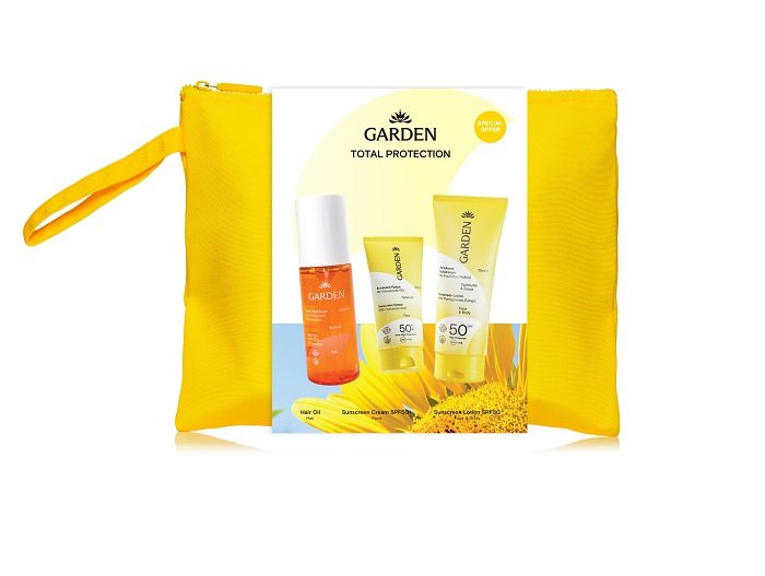 Αντηλιακό Γαλάκτωμα με Εκχύλισμα Ροδιού Πρόσωπο & Σώμα SPF50 75ml + Αντηλιακή Κρέμα Προσώπου με Υαλουρονικό Οξύ SPF50+ 25ml + Λάδι Μαλλιών με Αντηλιακή Προστασία 100ml + Garden Μεγάλο Ριγέ Νεσεσέρ