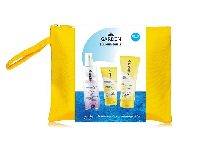 Αντηλιακό Γαλάκτωμα με Εκχύλισμα Ροδιού Πρόσωπο & Σώμα SPF50 75ml + Αντηλιακή Κρέμα Προσώπου με Υαλουρονικό Οξύ SPF50+ 25ml + Εντομοαπωθητικό Γαλάκτωμα Icaridin 20% 100ml + Garden Μεγάλο Ριγέ Νεσεσέρ